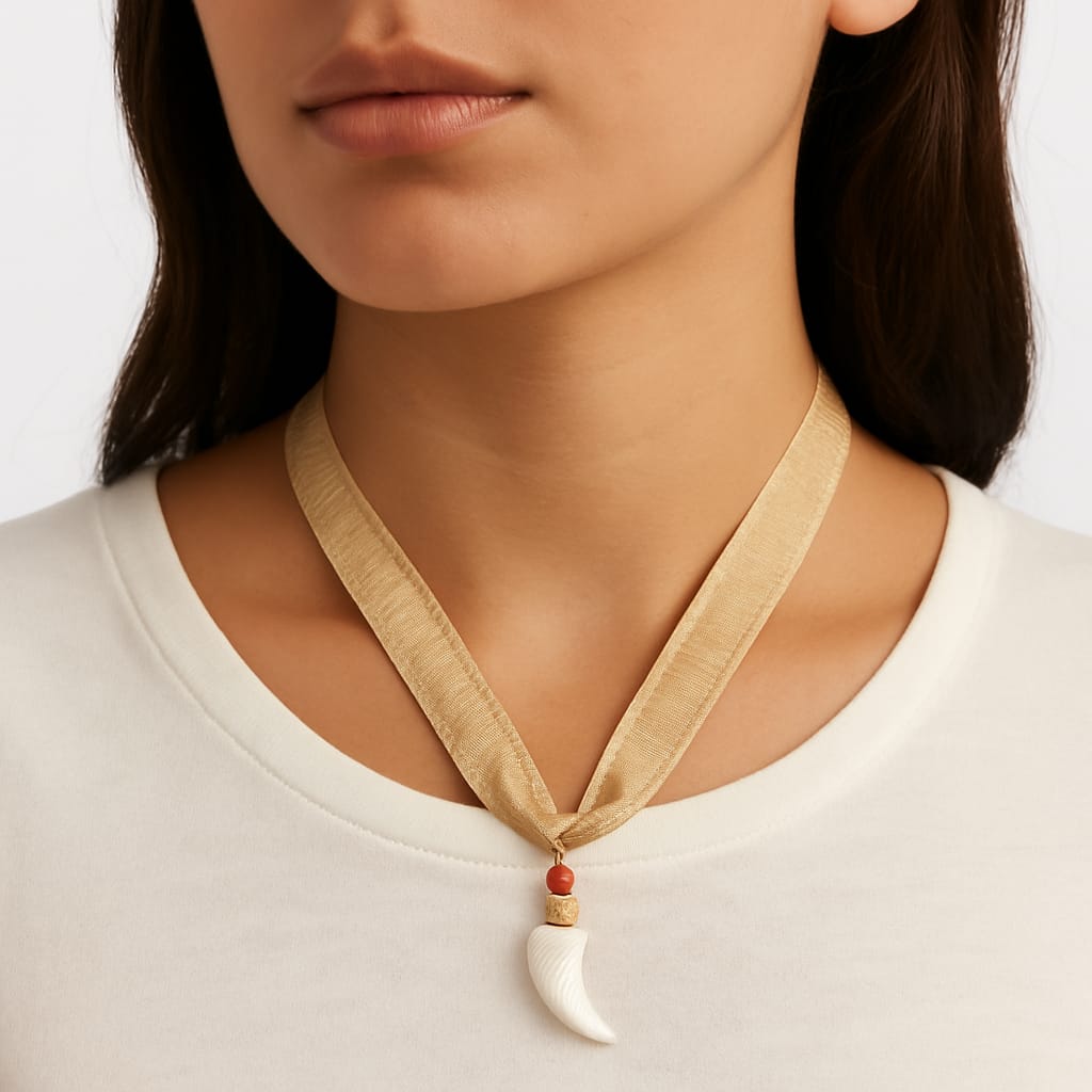 Collar con cinta de seda champán y cuerno de nácar con detalles dorados acero y piedra coral. Una joya elegante y protectora, creada para brillar con energía positiva.