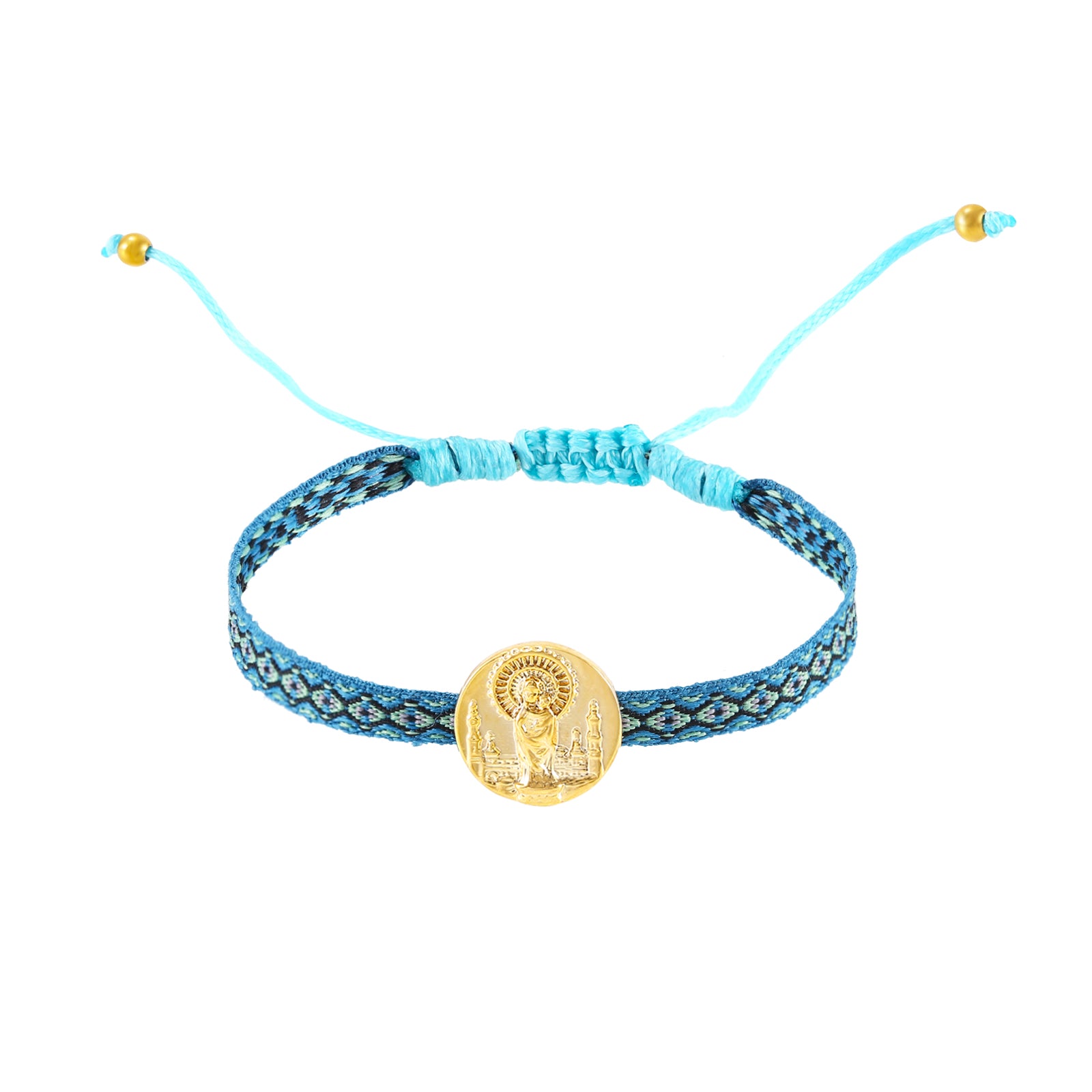 La pulsera combina una cinta textil suave, resistente y ajustable con una medalla dorada de la Virgen del Pilar finamente grabada.
